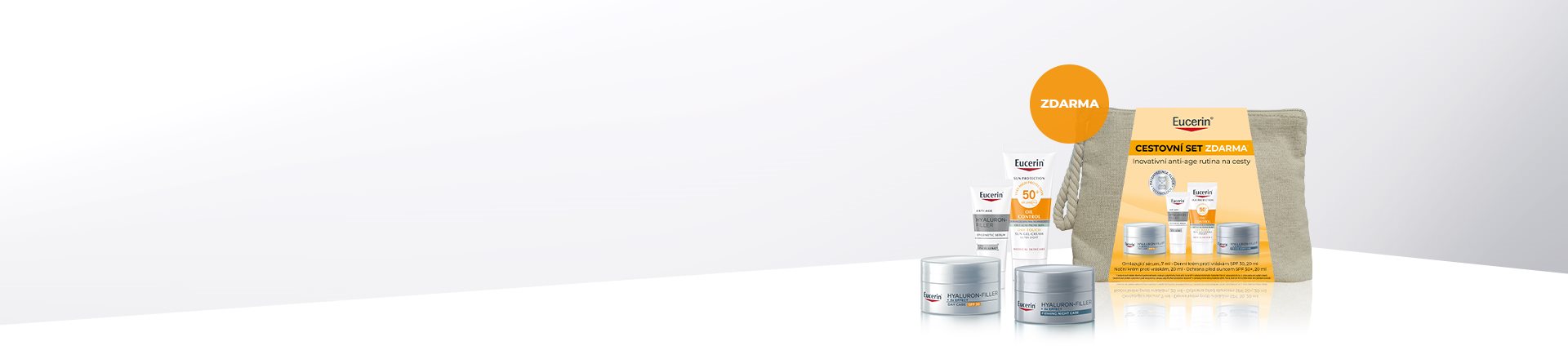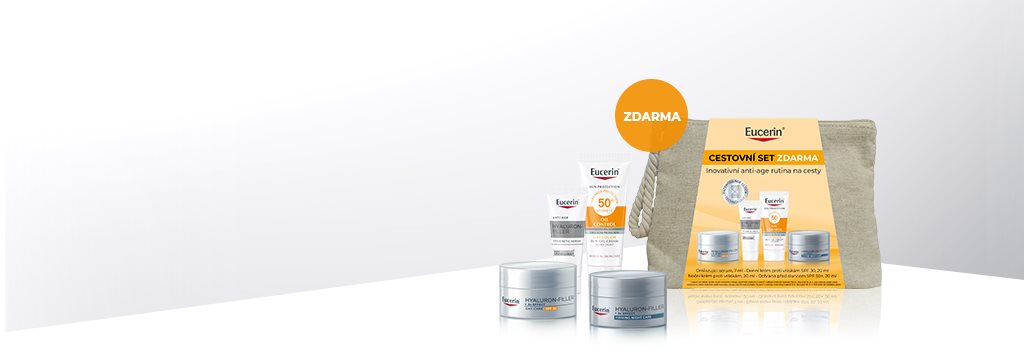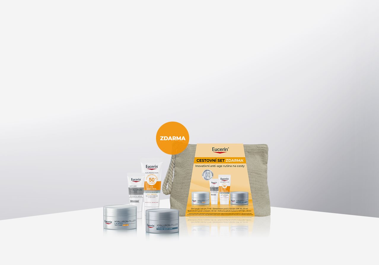 Cestovní set získáte zdarma k jednorázovému nákupu jakýchkoliv produktů Eucerin® v celkové minimální hodnotě 790 Kč.