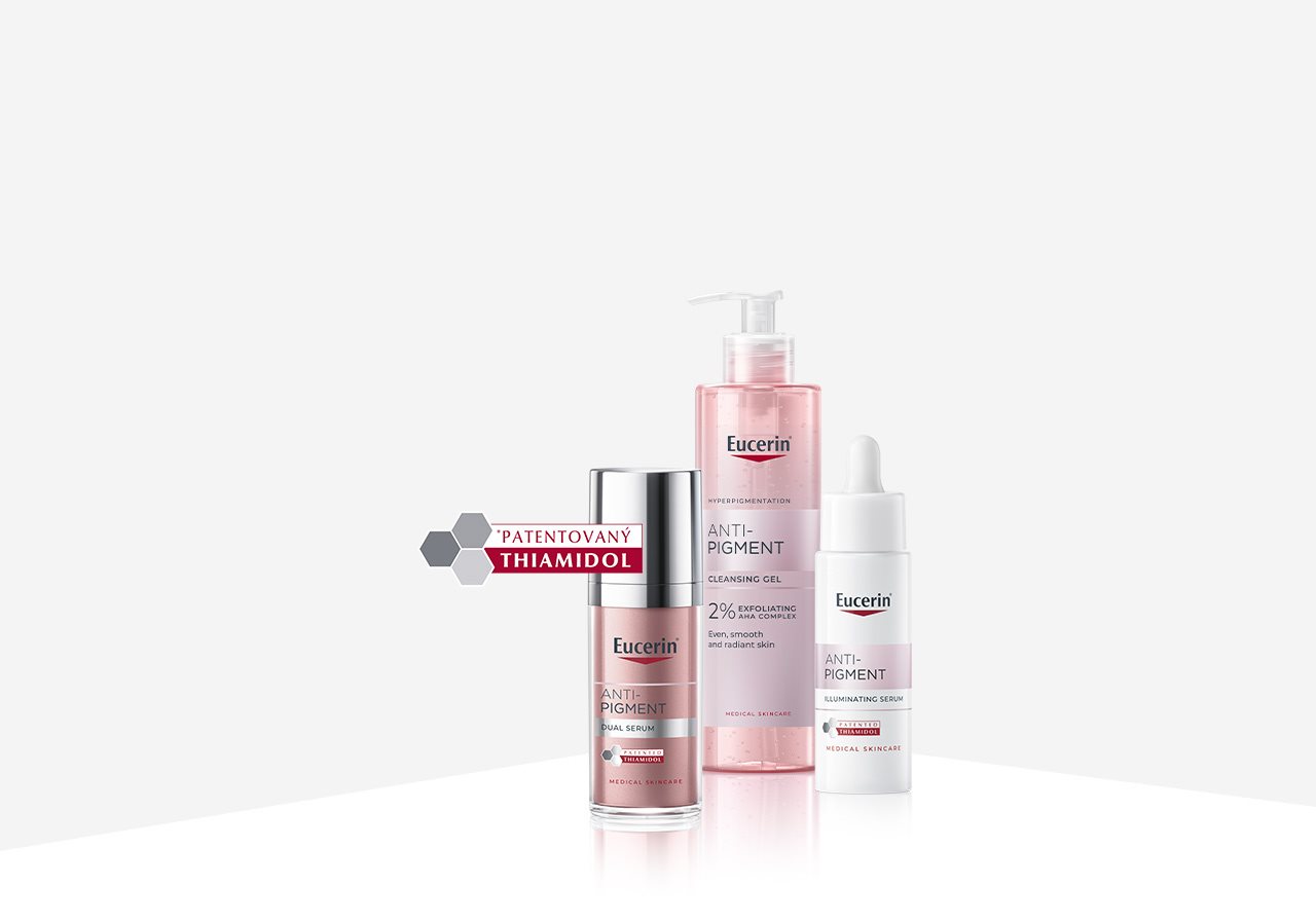 Sluneční záření, hormonální vlivy a stárnutí mohou vést k hyperpigmentaci: tmavě zabarvené plochy či stařecké skvrny (známé také jako sluneční skvrny), a pleť tak dostává nejednotný vzhled. Řada Eucerin Anti-Pigment byla speciálně vyvinuta na redukci hyperpigmentace pro sjednocenější a zářivější vzhled pleti.
