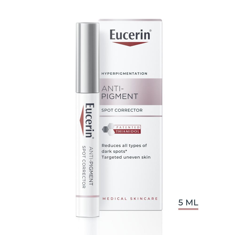 Eucerin Anti-Pigment Lokální korektor je nemastný gel se speciálním aplikátorem, který umožňuje nanášet přípravek přesně na drobné plochy hyperpigmentace. Obsahuje thiamidol, účinnou a patentovanou složku, která cíleně řeší příčinu vzniku hyperpigmentace snížením tvorby melaninu. Klinické a dermatologické testy prokázaly, že redukuje tmavé skvrny a brání jejich opakovanému výskytu. První výsledky jsou viditelné po dvou týdnech pravidelného používání.
