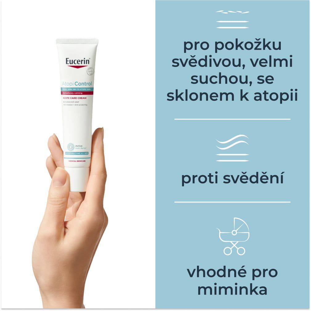 Eucerin AtopiControl Acute krém účinně působí spolu s léky, kdy pomáhá zlepšovat stav pokožky a zmírňuje svědění během vzplanutí atopické dermatitidy. Váš lékař vám poradí, jak a kdy používat lokální léčbu či užívat perorální léky. Pokud používáte lékařskou mast nebo krém, doporučujeme je nanášet jako první a nechat vstřebat, teprve poté použít Eucerin AtopiControl Acute krém.