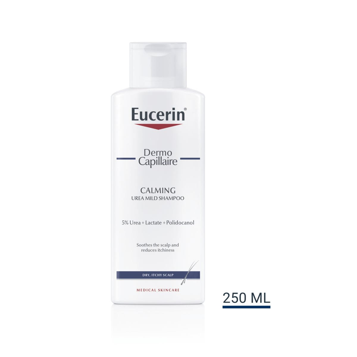 Eucerin DermoCapillaire Zklidňující šampon s ureou byl vyvinut speciálně pro suchou a svědící pokožku hlavy. Je obohacen o ureu a laktát – dvě z hydratačních látek, které si zdravá pokožka přirozeně vytváří – díky nimž poskytuje suché, svědící pokožce potřebnou vyživující péči. Obsahuje též zklidňující polidokanol, který pomáhá zmírnit svědění a podráždění.