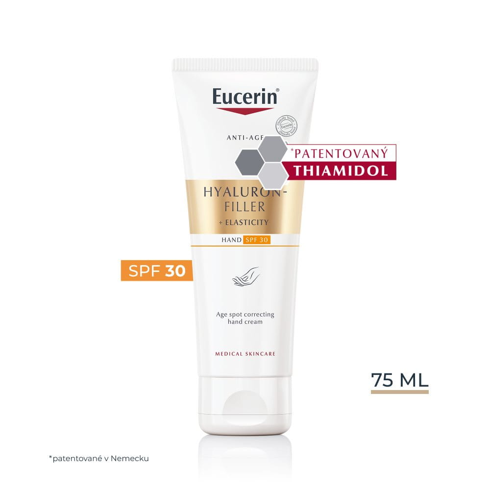 Ano. Eucerin Hyaluron-Filler + Elasticity Krém na ruce s depigmentačním účinkem SPF 30 obsahuje účinnou látku thiamidol, která zabraňuje opakovanému výskytu pigmentových skvrn.