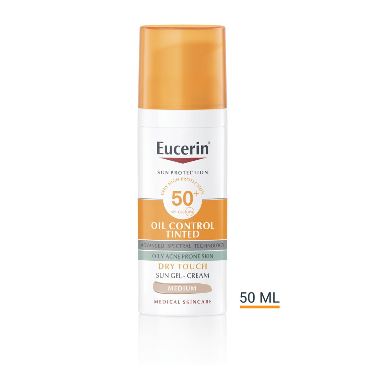 Eucerin Ochranný krémový gel na opalování na obličej Oil Control SPF 50+ středně tmavý je neparfemovaný a má velmi lehkou, nemastnou texturu. Klinické a dermatologické studie prokazují dobrou kožní snášenlivost u citlivé a aknózní pleti.
