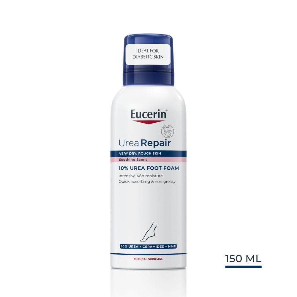 Eucerin UreaRepair Pěna na nohy 10% Urea přináší hrubé a suché pokožce chodidel intenzivní hydrataci pro okamžité zklidnění. Tento výrobek péče o chodidla kombinuje klíčové složky pro intenzivní a cílené řešení suché pokožky.